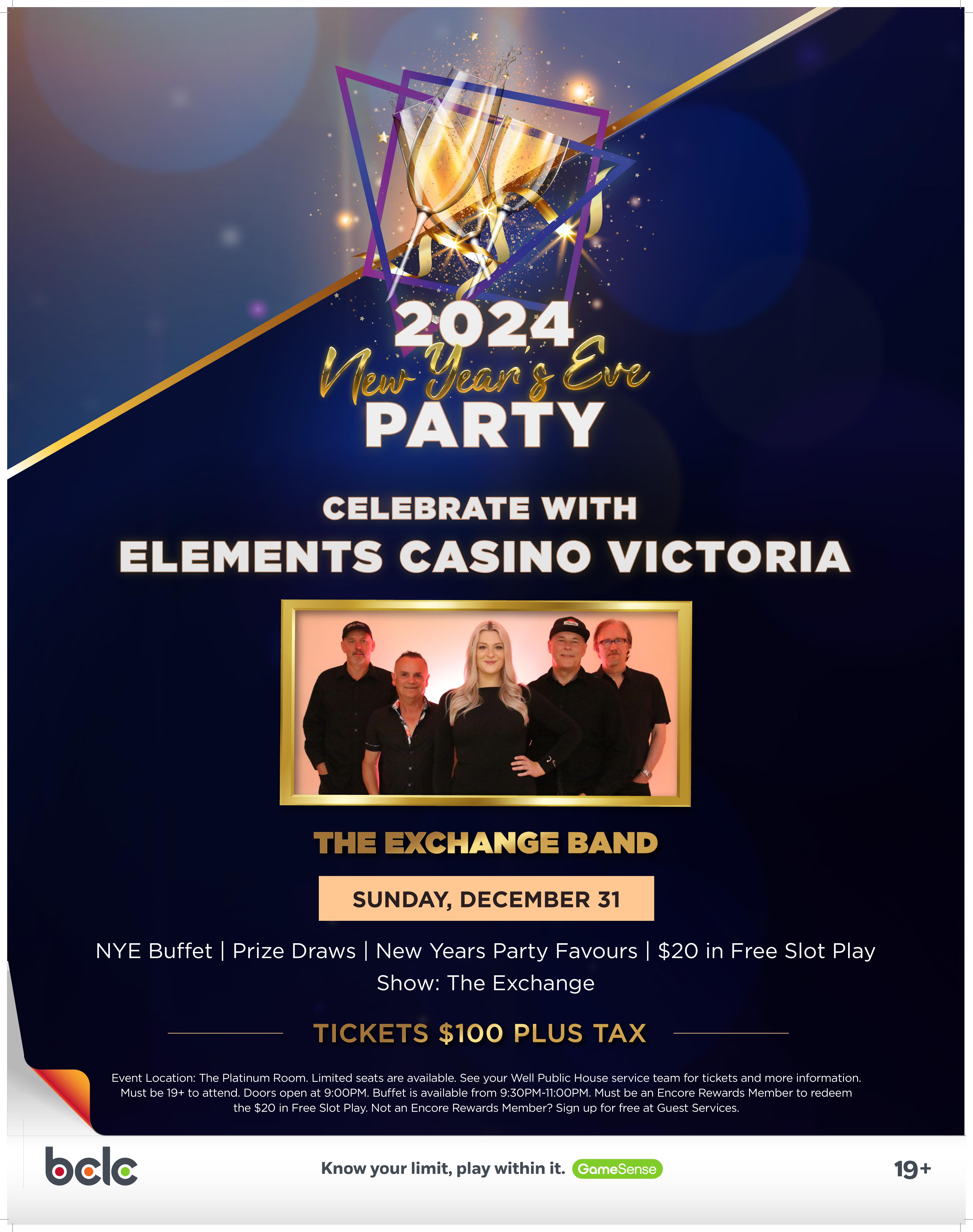 Join us at Elements Casino Victoria this New Year's Eve for an evening filled with vibrant entertainment and enticing rewards. Get swept away by the lively tunes of The Exchange band, and feel the excitement in the air with our enticing prize draws. Let's bid farewell to the old and welcome the new with an evening of electrifying fun and elegant revelry. Your memorable journey into the new year awaits!
