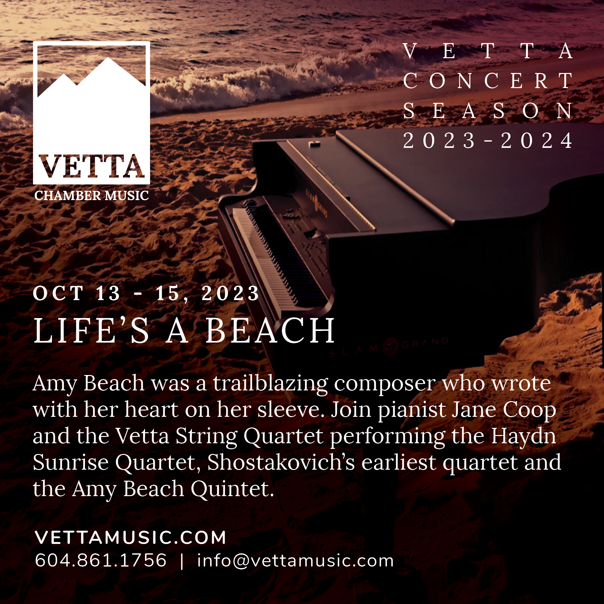 Amy Beach was a trailblazing composer who wrote with her heart on her sleeve. Join pianist Jane Coop and the Vetta String Quartet performing the Haydn Sunrise Quartet, Shostakovich’s earliest quartet and the Amy Beach Quintet.